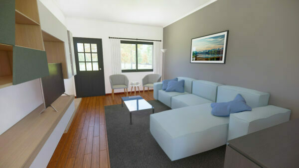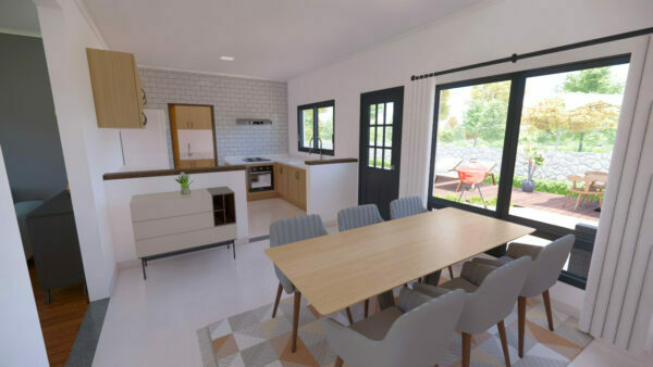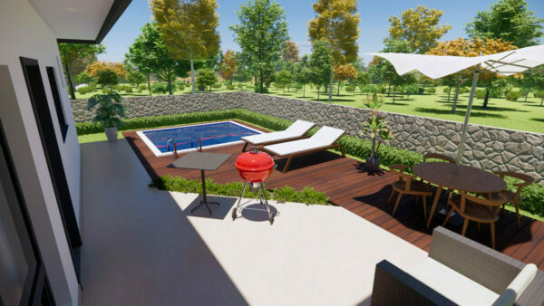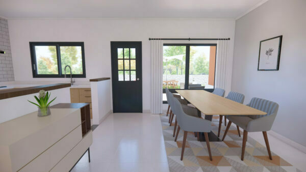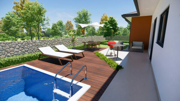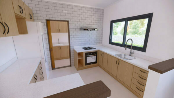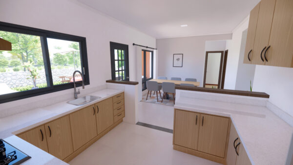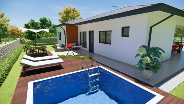 Casa con 3 dormitorios, uno de los cuales es una suite. Tiene un garaje en la parte delantera y una piscina en la parte trasera. En el interior, un salón-comedor de buen tamaño y una práctica cocina, así como un lavadero con espacio de almacenamiento. La casa se diseñó para ofrecer funcionalidad y comodidad, con iluminación y ventilación naturales.