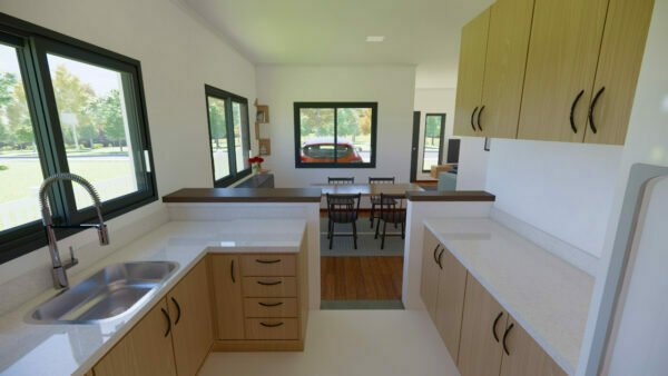Una casa sencilla y cómoda, con salón-comedor y una práctica cocina. Tiene lavadero y despensa con espacio de almacenamiento. Con 3 dormitorios, uno de los cuales es una suite, la casa se diseñó para ofrecer funcionalidad y comodidad, con iluminación y ventilación naturales.